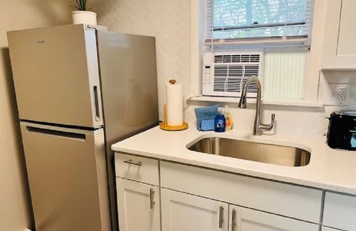 Our apartment building is dedicated to traveling professionals. This studio has a queen size bed, full size kitchen and appliances, and spacious bathroom. The living room has a couch, smart tv and fast WiFi and free parking. There is washer and dryer in the common room of the building available for guests.
