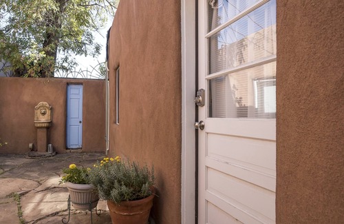 The Cottage at 453 Cerrillos, City of Santa Fe Short Term Rental Permit 157845, is a 500 square foot studio cottage with a privatecourtyard, less than three blocks from the Historic Santa Fe Plaza. This beautiful, recently renovated, full kitchen, one queen bed Cottage is part of a classic Santa Fe Compound of buildings dating back to New Mexico's Territorial Period before 1912. The compound at 453 Cerrillos includes The Loft at 453, VRBO #1261468 (1 br/1 bath) and Mae's Casita at 453, VRBO #1562504 (2 br/2 bath). 233 W Manhattan uses the same parking and includes Casa Dominguez (1 br/1 bath) and Circa 1885 (1br/1bath). The property is remarkably quiet given its close proximity to the Santa Fe Railyard District, the Historic Santa Fe Plaza, Canyon Road and the State Capitol grounds. The Cottage is now divided into a complete kitchen with full refrigerator, microwave, toaster oven, dishwasher, range and counter-cooktop, a sleeping area with closet, and a living room and dining area. The bathroom has been sensitively renovated with a large shower, subway tiles and mosaic floor tiles in a vintage style. Off the adjoining private parking lot there is a good sized courtyard shared with a two-person law office. Santa Fe's iconic coffee shop, Ohori's, is across Manhattan Street just steps away. Santa Fe's best bakery, Sage Bakery, is conveniently around the corner. Performance venues Lensic Theater and St. Francis Auditorium as well as Site Santa Fe, New Mexico Museum of Art, the Palace of the Governors and the New Mexico History Museum are all less than a 10 minute walk from the Cottage.