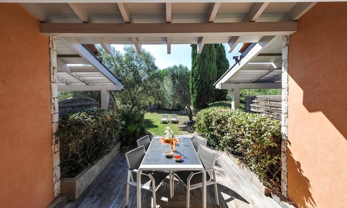 Kalliste means “island of beauty” in Greek. It is a luxury 4-starsemi-detached studio for 2 people, located on a listed site at the heart of a very peaceful little valley. Covered with dry stones and Italian-style plaster, it has all the charm of the houses of the South.A superb cedar wood decking terrace leads to a magnificent private garden, tastefully planted with trees and lush greenery. Its level layout, Mediterranean décor and welcoming, refined designer atmosphere will transport you to a magical world. Enjoy its idyllic setting near Bonifacio harbour and the citadel cliffs (1km), the sea for windsurfing and boating, beaches like Rondinara, Palombaggia or Santa Giulia for relaxation, the famous Lavezzi Islands marine park for sea diving, the fabulous “Sperone Golf Course” (3km), the mountains for hiking (GR20), and the local gastronomy (sea urchins, aubergines à la bonifacienne, cheese and cooked meats…).For sports fans, our house is conveniently located for all activities: sailing, water-skiing, wakeboarding, jet skiing, diving, windsurfing, boating, fishing, sea trips, golf , riding, hiking, canyoning, mountain biking, paragliding, quad biking…The studio Kalliste is ideally located in the far South of the Island of Beauty: 25 km from Figari Airport, 30 km from Porto Vecchio and 150 km from Ajaccio. You will like : - A 4-star, 30m² studio for 2 people- Private garden- Hotel quality bedding for your utmost comfort,- Fitted kitchen (glass-ceramic hob, electric oven, microwave, dishwasher, fridge/freezer…)- Air conditioning- TV, DVD players, satellite channels- Free internet connection- Hotel safe- One bathroom- Toilet- Washing machine; table and ironing board- Outdoor table, patio furniture- BBQ- free Parking- Cot, highchair, small bathtub and pushchair available on request
