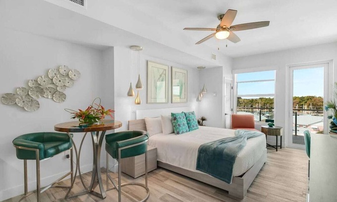 Our 1-bedroom studio suite with a king bed, large bathroom and balcony is the perfect getaway. This studio suite has a fully equipped kitchenette for making a breakfast, lunch or a quick snack. There is a table for 2 and desk area for those who need to do a little work while here. The balcony is perfect for morning coffee, and the sounds of sea birds & gentle island breeze is free. From the balcony you'll enjoy a diagonal view of the canal, watch as dolphins & manatee swim by and enjoy the amazing sunsets.
