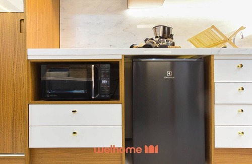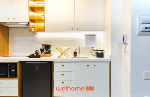 Na parte da cozinha, o espaço conta com armários, frigobar, micro-ondas, cafeteira tradicional, cooktop de indução com duas bocas, panelas e utensílios básicos para refeições práticas.