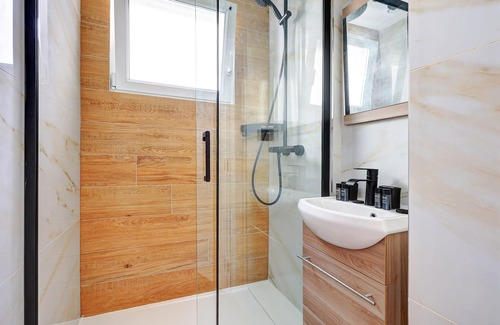 Salle de bain élégante : Profitez d'une douche revitalisante, accompagnée de produits de toilette de qualité pour une expérience agréable.
