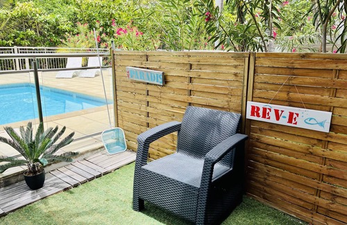 The studio is located in a very quiet residence on the ground floor overlooking a swimming pool (very uncrowded because the residence has 95% residents year round). The studio is composed of an entrance, a main room with fully equipped American kitchen, a bathroom, cupboards, a veranda (covered terrace) with living room and garden table as well as a small garden with lounge chair. You will find the comfort of your daily life with a flat screen TV, internet connection, barbecue, parking, etc.