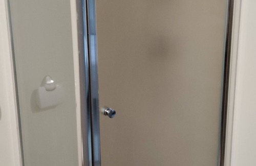 🚿 A bathroom with shower, a cabinet with a single sink and a toilet 🚽