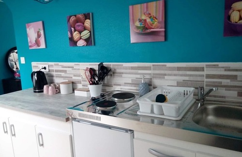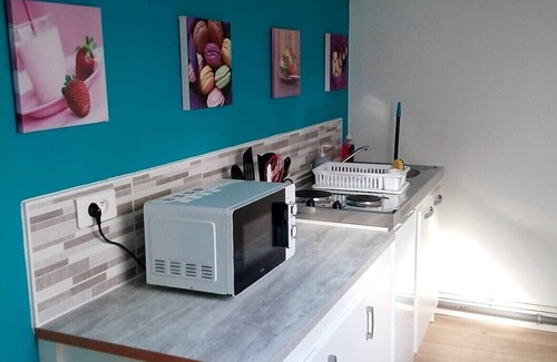 Main room equipped with 1 double bed 160 cm x 200 cm, 2 bedside tables, 1 clothes rack, 2 dressers, a desk and a television. Separate and equipped kitchen (Coffee machine (Senseo), fridge, microwave, electric hob, kettle, dishes, coffee pods, tea, sugar, salt, pepper, olive oil ...
