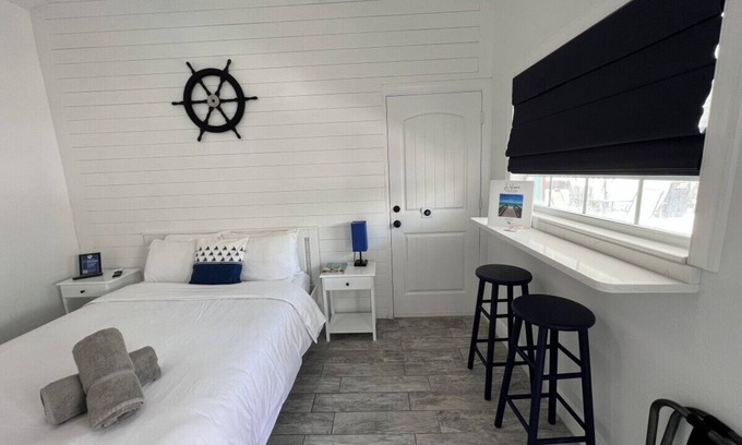 Experience a romantic getaway at Studio Steps to Beach w/Queen Bed #2, an ideal wedding accommodation nestled just steps away from the serene Sunset Beach. This charming studio offers the perfect blend of comfort and convenience for you and your guests.
