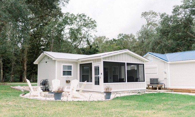 Cozy studio style cabana on the Mermentau River, sleeps up to 4 adults. This cabana offers gorgeous views of the Mermentau River as well as scenic swamp views. Relax on the large deck over the water while you enjoy the sunrise and/or sunset. Deck has plenty of seating as well as a grill area. Private boat launch on site, plenty of parking available to our renters. This studio style apartment is very private, offers guests a full kitchen, full size bathroom, queen bed, sofa in sitting area, breakfast table and stools, outdoor screened in patio with seating and grill. Outside of the cabana we offer a fire pit with plenty of chairs as well as a picnic table to enjoy your meals outside while taking in the beautiful view! No laundry room accessible.