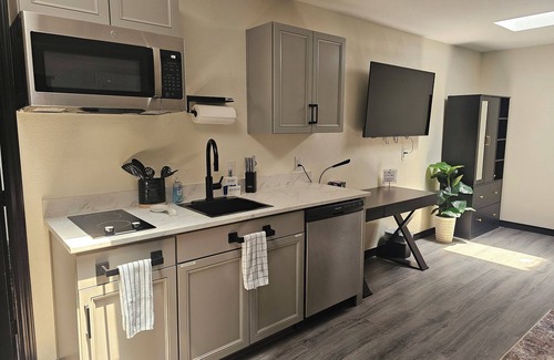 Newly renovated separate guest house with separate access to private parking and privacy fence. Studio suite with 1 bedroom 1 bath kitchenette/dinning/laundry areas. Pet friendly with a small yard for pets. Rest in a Queen bed or relax in a double reclining love seat while watching popular apps on firetv. Downtown, Midland Memorial, and all you need is just minutes away. Great stay whether in town for work, visiting family, or sports.