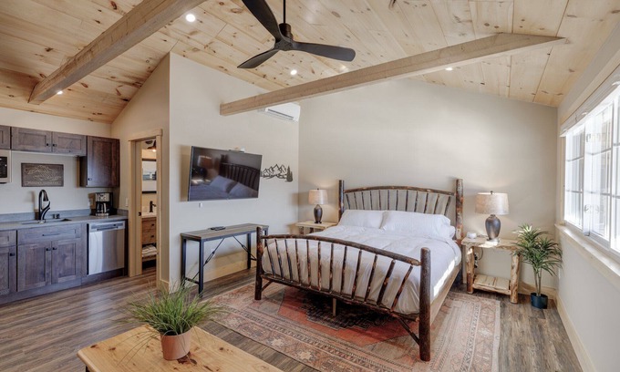 One of 11 luxury rooms at the Lodge by Sunapee Stays, nestled in Sunapee with spectacular views of Mount Sunapee just out your front door. This modern rustic studio room features hickory log furniture throughout, king bed and full size memory foam sofa bed. The kitchenette is fully stocked with all the amenities to eat in. The bathroom boasts a sanctuary of it's own with pebble stone shower surrounded by subway tiles and your very own bidet toilet! The shiplap vaulted ceilings and plush Adirondack style furnishings evoke relaxation after your day of adventures. The Lodge offers a common indoor lounge area featuring contemporary and classic family games along with a TV. Outside you'll find a semi private patio complete with rocking chairs and a seasonal outdoor pool with a views of Mount Sunapee!