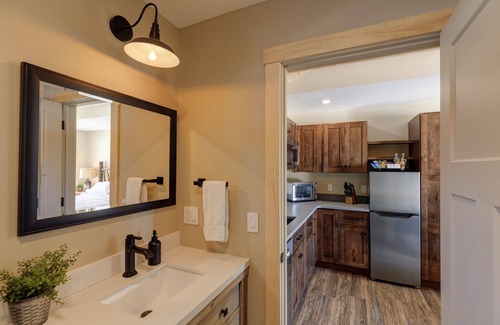 One of eleven luxury suites at the Lodge by Sunapee Stays, nestled in Sunapee with spectacular views of Mount Sunapee just out your front door. This modern rustic studio suite features hickory log furniture throughout, king bed and full size memory foam sofa bed. The kitchenette is fully stocked with all the amenities to eat in. The bathroom boasts a sanctuary of its own with pebble stone shower surrounded by subway tiles and your very own bidet toilet! The shiplap vaulted ceilings and plush Adirondack style furnishings evoke relaxation after your day of adventures. Common washer and dryer located on property. Later this winter, the Lodge will offer a common indoor lounge area featuring contemporary and classic family games along with a TV. Outside you'll find a semi-private patio complete with rocking chairs and a seasonal outdoor pool with views of Mount Sunapee!
