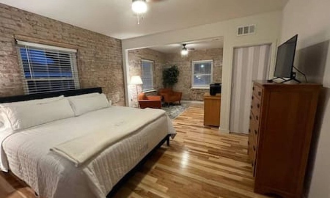We kept much of the original exposed brick walls and retained much of the "mid-century" woodwork original to the building. From there, a full remodel with amazingly unique touches set our space apart from other nightly stay options. The Studio Suite features a king bed, a sitting area, a full bathroom with a distinctive curved shower door, plenty of towels and even a kitchenette with utensils, mini-fridge, sink, microwave, and even a Keurig coffee maker with complimentary K-cups, etc. If you’ve ever wanted to live in a downtown apartment, this will be the perfect opportunity to spoil yourself!