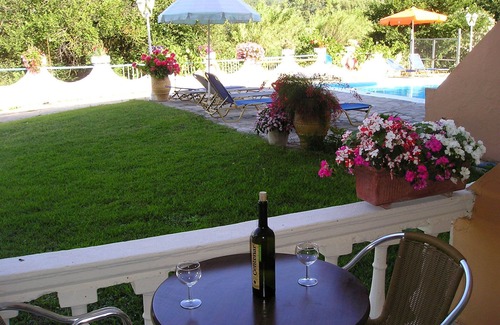 Self catering studio with one bedroom eqquiped with two beds. Shared pool available, parking and free wi fi. Room has ensuite bathroom and toilete, kitchenette and fridge with kitchenware & utensils and furnished balcony with garden/pool view. Beach is 200 meters away with shops and restaurant. Bus stop from/to corfu town is near. Super market and atm machine 100 meters distance. Walking distance to both resorts, Mesongi and Moraitika.
