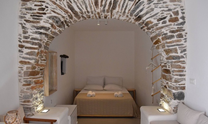 Escape to Chora Cozy Studios - Verde in Kythnos! A stylish 1-bedroom retreat for 3, featuring a private patio, full kitchen, WiFi, A/C & no stairs. The perfect spot for a relaxing island getaway!