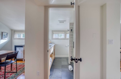 Hardwood floors and a beamed ceiling frame this gorgeous studio apartment at the Nehalem River Inn. Clean and spacious, and surrounded by glorious river and mountain views, this unit has all you need for a relaxing stay on the North Oregon Coast. A queen sofa sleeper lets you invite guests to join you, and the kitchenette and dining table make snacks, breakfast, and takeout easy to manage. The king bed has upscale linens, and the bath has a beautiful walk-in shower; you’ll stay comfortable with heated slate floors in the bath and air-conditioning in the unit for the summer. Enjoy the attractive grounds of the Nehalem River Inn, and join other guests at the fire pit near the river to share stories from your day of exploration.