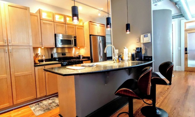 This 790sq ft studio basks in natural sunlight, has a hypoallergenic Talalay queen size bed, viscose bamboo sheets/duvet, full grain leather Eames chair and an on-wall 75in Sony TV. It has high ceilings with exposed brick/duct central heat/air, a modern kitchen with stainless steel appliances including dishwasher, gas stove and large refrigerator. There's also cabinet lighting, track lighting, island seating with solid surface quartz countertops. Carrying into the modern bathroom, there is a large one of a kind circular custom tiled shower. Next to a built-in private work space, there's a washer/dryer with closable doors. The open hardwood floor plan extends with roof access via a custom built iron spiral staircase to deck amenities including grill, deck chairs, table, and lounge chairs for sunning, all overlooking Downtown Evansville, just half a block from Main Street.