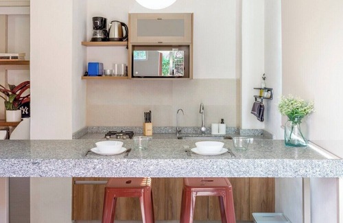 This modern loft in Casa Rosa, located near the Aqueduct of Queretaro, offers a unique and cozy atmosphere. With 2 queen beds, private bathroom and a fully equipped kitchen, it is the perfect place to enjoy comfort and style. The space features a private terrace, ideal for relaxing outdoors, and a TV with Netflix for your relaxing moments. Plus, high-speed Wi-Fi keeps you connected. Perfect for couples, friends or families.