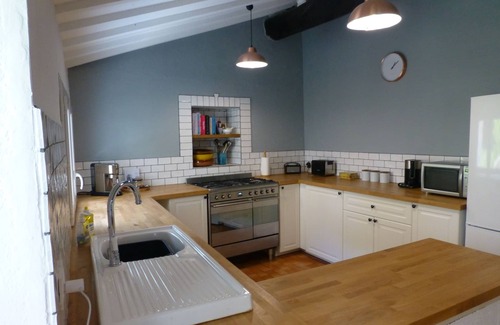 Kitchen with table and woodburner