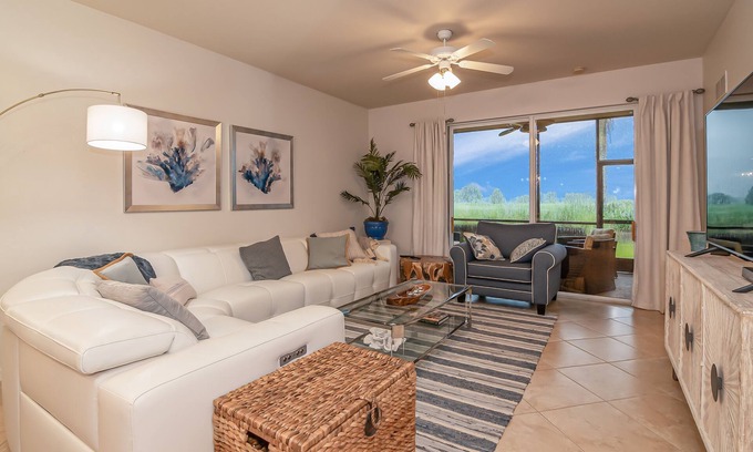 From the moment you step inside our spacious front lanai, you are greeted with coastal luxury. Newly furnished and professionally decorated in the summer of 2020, our open floor plan includes all the amenities to enhance your Florida stay. Our kitchen boasts granite counter tops, stainless steel appliances, and ample custom cabinets stocked with pottery barn dishes, glassware, cutlery, gourmet spices, coffee maker, blender, toaster, George Foreman grill, and a double deluxe air fryer. A haven for entertaining, 8 guests may dine comfortably in the formal dining area, drinks may be served from the built-in bar, or a casual meal for 4 enjoyed in the breakfast nook. The living room features a massive upscale leather sectional with 3 power reclining sections from which to view our 65" flat screen TV. Our back lanai is filled with comfortable outdoor furniture& lanterns and walks out onto green #3 of Cypress. (Harassing the golfers optional)