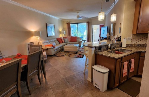 Beautifully decorated 3 Bedroom, 2 Bathroom Villa in the Gated Community of Gran Paradiso. Completely furnished, this home offers a spacious, open concept living/dining/kitchen. Villa sleeps 6 comfortably. Master suite features a KING bed, 2 closets, bathroom w/double sinks, soaking tub and separate walk in tiled shower. TV/ Cable in Master Bedroom. Bedroom 2 has 1 Queen bed and TV/Cable. Bedroom 3/Den has 2 Murphy beds and TV/Cable. Living room includes a sectional couch and has a 55" flat screen TV with cable and a Blu Ray/DVD player. Kitchen has granite counters and stainless steel appliances. Comfortable seating for six at the large dining table with additional seating at the breakfast bar. Wi-Fi is also available.