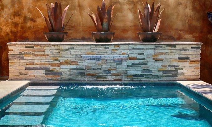 The lower level offers a tropical oasis with a gorgeous pool with a waterfall, lounge chairs, tropical plants and palm trees. A large garden area with a palapa provides a private escape to enjoy a book in the shade. Adjoining the pool area is the “Stone” bedroom, appropriately named for the beautiful stonework wall. This bedroom has a private marble-tiled bathroom with a unique indoor/outdoor shower.