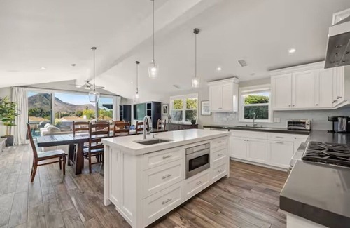 Enjoy Southern California indoor-outdoor living at its best! This home offers beautiful mountain views and luxurious outdoor living spaces. It is perfect for families, professionals, or travelers looking for a peaceful home base. Featuring... Pool and spa with water features, safety cover. Fire feature, outdoor kitchen, outdoor dining. Nicely equipped Chef's kitchen. Luxurious bedding and finishes. Workspace for two. Close to coffee, grocery, many dining options, open space trails & parks.