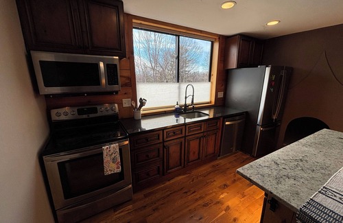 Come stay this season and enjoy privacy, fishing, hiking, ice skating rink and sledding in back yard park, direct access to snowmobiling trails, great hiking, and much more