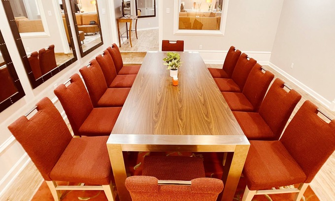Be blown away by the extravagance and style of this huge 5BR with 7 Queen Beds, a giant Great Room with a 12 seat dining/conference table, 4 private workstations, A 0.5 acre backyard with a park, Exquisitely Styled and made perfect for private and corporate events and trips.