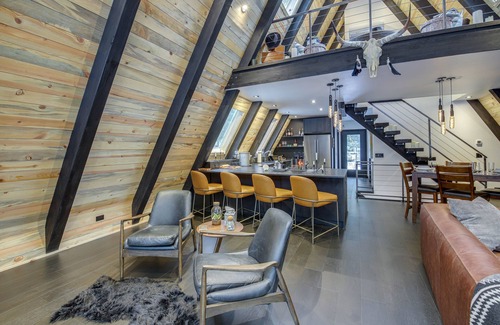 A-FRAME FEATURES: 2 Smart TVs, wood-burning stove, dining table, loft w/ sitting area, ground-floor family room, soaking tub, books, board games, floor-to-ceiling windows w/ forest views, contemporary furnishings & decor