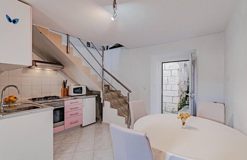 This two-storey apartment is located in the center of the picturesque fishing village Racisce and near the pebble beach. The kitchen, dining room and bathroom can be found on the ground floor. The internal staircase leads to the upper floor to the bedroom with terrace, from which a beautiful view of the Adriatic extends. If you love peace and quiet and want to spend your vacation far from mass tourism, this is the right place for you. Nature lovers can look forward to walks through olive groves and vineyards, while sun worshippers, west of Racisce, will be delighted by the bays with pebble beach Vaja and Samograd.