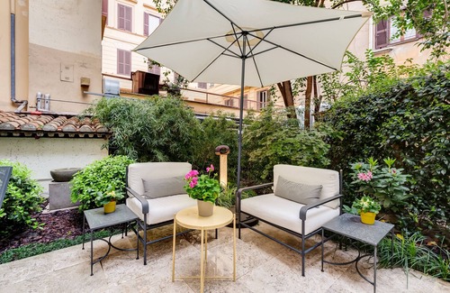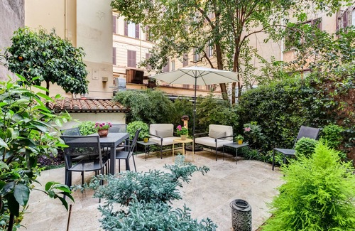 Just steps up a quiet street off Piazza Barberini and just behind the elegant Via Veneto,lies this newly renovated garden apartment with two bedrooms and two full bathrooms in a historical building from 1600's.