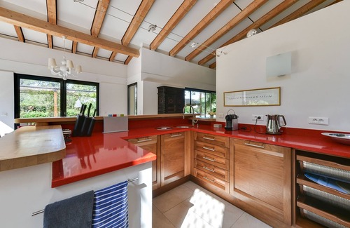 Inside the living area is open plan and spacious. The kitchen has red granite work surfaces, two sink areas, a long bar and equipped with top of the range appliances/culinary aids for budding chefs. These include Miele ovens, including steam oven, plates warmer, microwave, Nespresso machine, mixing machine, toaster, induction plaque and extractor fan, dishwasher, fridge and separate freezer unit. Just off the kitchen is a separate laundry with a second fridge, washing machine, tumble dryer etc. The kitchen connects to a separate dining area with large table and chairs and onto large terraces for alfresco dining/lounging. The large terrace will comfortably seat guests under the pergola for summer dining.