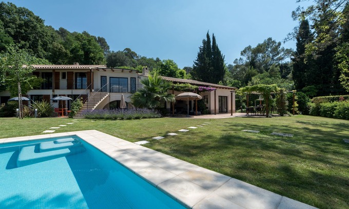This spacious architect-designed house is furnished to a high standard with several original art pieces. It lies in peaceful wooded surroundings, and is reached at the end of a private road in a residential area, where you will find beautiful woodland and canal sidewalks. The property has extensive terracing and its own gardens, including large swimming pool. It is an ideal base for a holiday exploring the Cote D'Azur and Provence, with the famous Mougins Village a few minutes’ drive away.