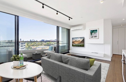 Stylish, light-filled two bedroom apartment, centrally located, with spectacular views from Port Phillip Bay, nature parks and bustling Toorak Rd.