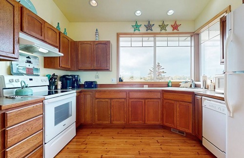The interior of Lighthouse Manor is just as impressive as its surroundings. The living room boasts a cozy gas fireplace, a TV, and high-speed cable internet, while the spacious kitchen provides ample counter space and all the essentials for preparing delicious meals. With a layout designed for gatherings, this home is perfect for creating cherished family memories against the backdrop of the mesmerizing views.