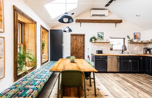 The kitchen, dining, and living area is one open space with light streaming in from skylights in every corner. The kitchen has new appliances and is stocked with all the equipment needed to cook a feast. We supply olive oil, salt, pepper, sugar, paper towel, and a large selection of spices. We have a Chemex and a drip coffee machine. We supply ground coffee but also have a coffee grinder in case you'd like to pick up some local beans on the way.