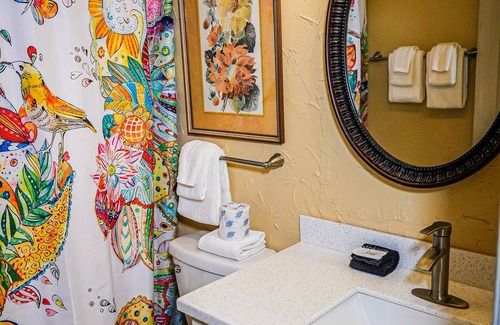 Inside, you'll find the master bedroom featuring a king-sized bed and a private en suite bathroom, ensuring privacy and comfort. The second bedroom comes equipped with a queen bed, while the open loft hosts two full beds, making it ideal for your wedding party or family. As you cozy up by the wood-burning fireplace during cooler months, don't forget to take in the stunning views from the deck, which can serve as a picturesque backdrop for your pre-wedding photos. Additionally, you’ll have access to all on-site amenities, enhancing the convenience for you and your guests.