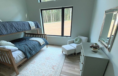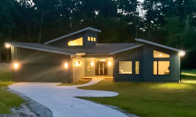 Are you searching for a quiet, scenic spot for a couples or girlfriends getaway? We have amazing views of nature (enjoy our wild turkey, Florence going for her daily jog & blue herons nesting in the trees), a tranquil setting, and a luxurious, modern space in which to unwind. Leave your worries and clutter at home and relax in this stunning contemporary home in the woods. Soaring ceilings and windows light up this truly special space. This house features 2 king bedrooms, a sauna in the primary bathroom and a screened in porch with fans. Additional sleeping spaces include a 3rd bedroom with queen and twin xl bunks allowing the house to sleep up to 7 adults. Kitchen features a 9 foot island, a wet bar/coffee bar and plenty of space for those who love to cook.