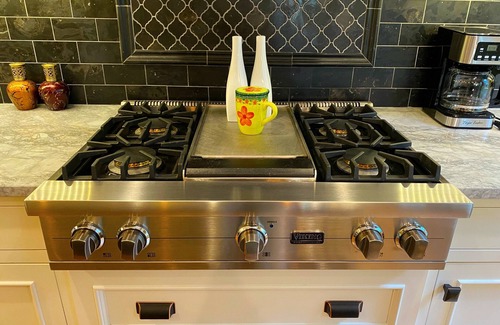 Step into the kitchen, and find a space that the original owners of the home could have never imagined. State-of-the-art appliances transform cooking into a dream. A large island for prep and gathering, separate cooktop w/griddle, and professional double French door oven are just a few of our favorite features. Enjoy a freshly brewed pot of coffee for the group or use the Keurig for your morning joe (or tea kettle if tea is your preference). The kitchen is stocked with a microwave, toaster & Power QuickPot and we've supplied dishes, silverware, basic utensils & cookware, including some fine china for special occasions. This level also includes a powder bath off the kitchen near the back entry.