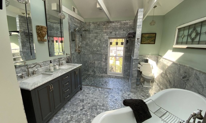 Ascend the grand staircase upstairs, and you'll discover the master/primary bedroom suite, which features a spacious marble bathroom with a luxurious shower, skylight and separate claw-foot soaking tub. A comfy California King bed awaits you here for your slumber. A washer & dryer are conveniently located in the master bedroom hallway for any laundry needs during your stay, and we have included some travel essentials for you in the closet, such as an iron and board, a steamer, and more.
