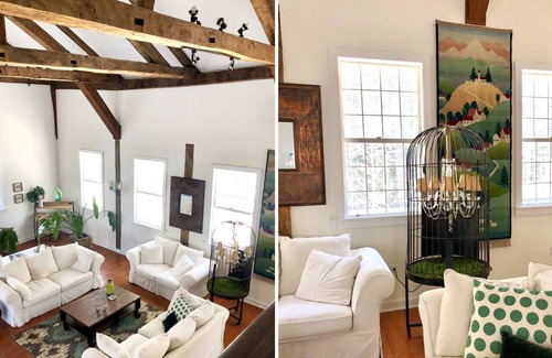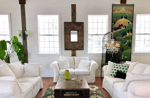 The Church once served as a Congregational church, then it was used as the town garage for storing tractors, later falling into an extreme state of disrepair. In the 70’s, a seasonal visitor to the area fell in love with the bones of The Church and set about to restore it over the next two decades – redemption! For architecture and construction lovers, we have an album on the property that documents all the renovations that took place over the past half century, with notes from the caretakers/owners who helped to make it what it is today. Most notably, the double truss rafters in the great room were exposed, showcasing beautiful architectural geometry and hand hewn craftsmanship. The great room will literally take your breath away with soaring ceilings with 200 year old wood beams, and large windows on two sides that flood the room with light. Love music? The Church has an outstanding Bose sound system that takes advantage of the acoustics. Download the Bose app to your phone (instructions included after rental) to stream your own music. Enjoy the fully stocked library (is there anything cozier than sinking into a deep couch on a rainy day, reading the day away?) games for all ages, and cable TV with Roku so you can stream your own providers. You’ll be surrounded by pieces of art and history - reclaimed altar rails, rescued stained glass windows, antique artifacts, quirky accents, art and decor that is both eclectic and inviting. Belly up to the pulpit bar for an evening cocktail, or work remotely using our wi-fi internet access.