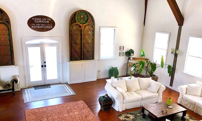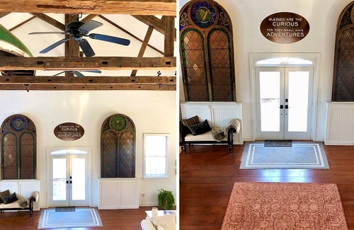 History is everywhere in the church, from the historically accurate reproduced windows and doors, to the centuries old rafters marked by time. The upstairs converted choir loft features a master bedroom with king size bed, closet and reading nook, and a charming guest room with queen size bed. A third bedroom with a 4-poster queen size bed on the ground floor overlooks the back grounds. Staircases to the choir loft are narrow and somewhat steep, with one full bathroom and large soaker tub upstairs, one bathroom with shower downstairs. The kitchen features all the amenities, with updated stainless steel appliances and a light filled breakfast nook table perfect for morning coffee and keeping an eye out for our local wildlife.