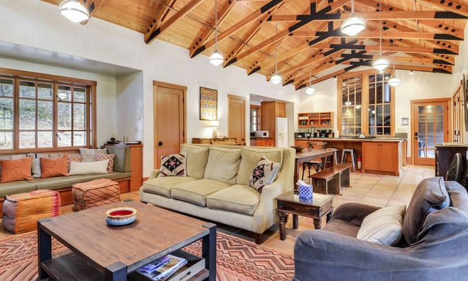 The Pool House, just down the driveway from the Farmhouse, was designed and custom built in 1999 by the current owners. Your first stop at the Pool House is the great room with open trestle ceilings, fireplace, built-in window seat, generous seating areas including a lovely wood dining table, and kitchen with ample wood and concrete counter tops. International folk art and on- of-a-kind furniture make this a remarkable space to gather. There are also musical instruments - a piano, guitar and drums - and sheet music and lyrics for the musically talented. With multiple exterior entrances and large outdoor gathering spaces, the vibe is distinctly upscale camping. An extensive covered patio with built in grill and large table connects the great room to the bedrooms and bathrooms. The two spacious bedrooms and half bath (toilet and sink) are up a set of exterior stairs. Exterior doors lead from a small covered outdoor hallway into each bedroom and the half bath. The bedroom facing the hillside has a queen bed and a private patio and the bedroom facing the lawn and pool area has two queen beds. Both have grand windows to allow sunlight and great views! On the ground level, the full bathroom is definitely upscale camping! The entrance is below the front bedroom and faces the pool area, but once inside the shower and toilet have separate rooms and there are benches and hooks for all towels, shoes and clothes while you play at the pool.