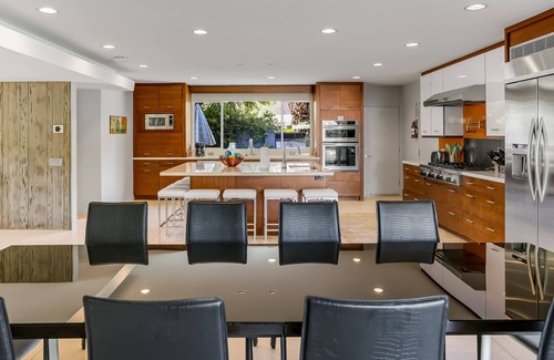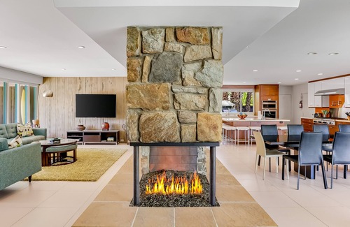 Experience the ultimate in sophistication and relaxation at this fabulous, completely remodeled Palm Springs vacation home. Brimming with modern fixtures, features, and furnishings throughout, and designed with the Palm Spring indoor/outdoor desert lifestyle in mind, this incredible vacation rental still retains much of its original mid-century modern charm. Inside this open and airy home, you'll find spacious and inviting interior spaces, walls of glass, and updated amenities to ensure the ultimate comfort for you and your guests. The well-equipped, gourmet island kitchen is equipped with almost every conceivable appliance and utensil to help make cooking at home a breeze. Take advantage of the top-of-the-line appliances here including a 48' refrigerator, two dishwashers, a six-burner stove with a griddle, a stove-top pot filler, and a wine cooler. The great room boasts two living areas surrounding a massive stone fireplace as the centerpiece.