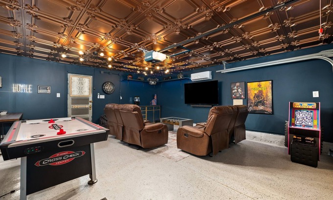 Entertainment abounds with a 55" smart TV with Netflix & Disney+, a private backyard with canopy, and the man cave featuring air hockey, darts, foosball, Pac-Man arcade, popcorn popper, surround sound theater, and a giant chess board on the garage door.