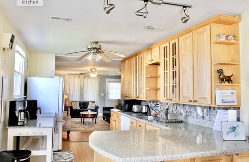 Fully appointed kitchen with appliances, including stove, oven, refrigerator, dishwasher, and microwave. Bedrooms are comfortably furnished with fresh crisp new linens, pillows, and bed coverings. Master bedroom features a private en-suite bathroom with a walk-in shower.