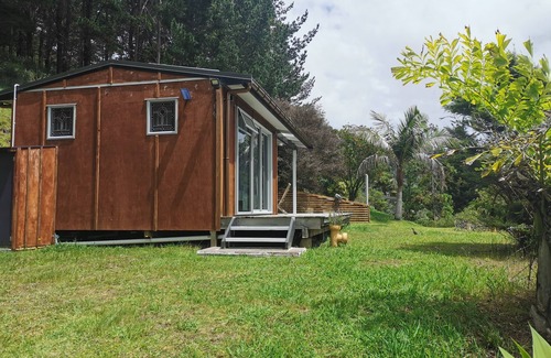Comfortable Queen bed, private kitchenette with hand built copper sink and benchtops and a small gas cooker. The bedhead is handmade from Rimu.