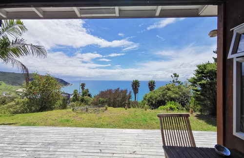 This hand built cabin is nestled high amongst trees and totally private - nobody can see the cabin, with no houses behind and only the beautiful 180 degree sea view in front. To the sides are mature plantings and trees.