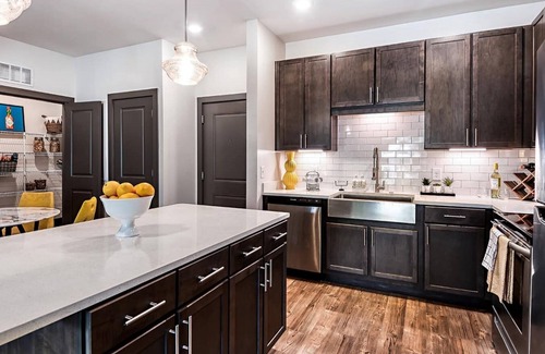 Our thoughtfully designed apartments feature sleek quartz countertops, stainless steel appliances, and custom cabinetry. Subway tile backsplashes and stylish pendant lighting add a touch of sophistication, while the large farmhouse-style sink with gooseneck faucet provides a functional and stylish centerpiece.