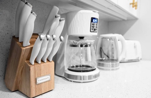 The well decorated living room area is decked out with a modern shaped sofa, a 55” Smart TV. This is the perfect place to hang out as a large group, whether you’re enjoying a family movie night or a fun game tournament from our large collection of board games.