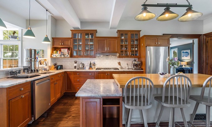 The kitchen is the best place to be in the home, with a fresh renovation and plenty of space for the entire family to hang out, cook, talk, and eat.